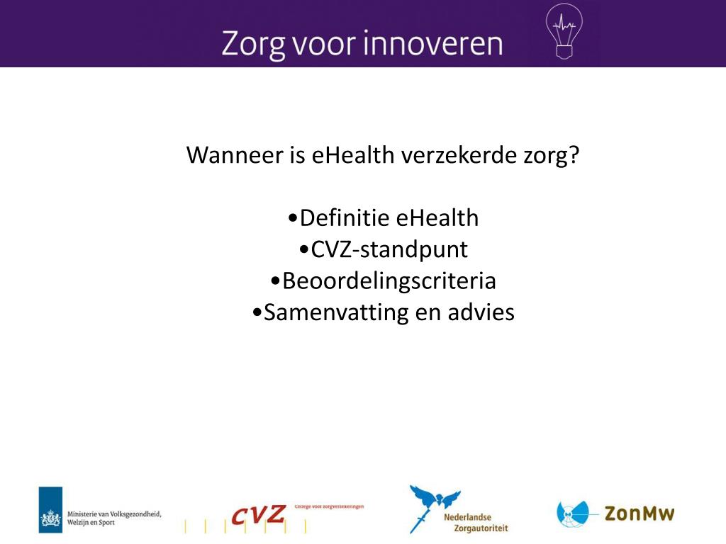 Wanneer is eHealth verzekerde zorg? • Definitie eHealth • CVZ-standpunt • Beoordelingscriteria • Samenvatting en advies
