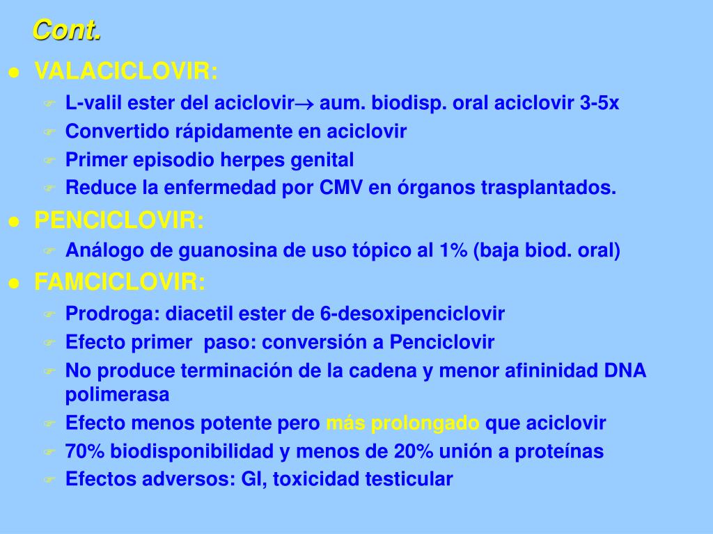 Cont. • VALACICLOVIR: • L-valil ester del aciclovir aum. biodisp. oral aciclovir 3-5x • Convertido rápidamente en aciclovir • Primer episodio herpes genital • Reduce la enfermedad por CMV en órganos trasplantados. • PENCICLOVIR: • Análogo de guanosina de uso tópico al 1% (baja biod. oral) • FAMCICLOVIR: • Prodroga: diacetil ester de 6-desoxipenciclovir • Efecto primer paso: conversión a Penciclovir • No produce terminación de la cadena y menor afininidad DNA polimerasa • Efecto menos potente pero más prolongado que aciclovir • 70% biodisponibilidad y menos de 20% unión a proteínas • Efectos adversos: GI, toxicidad testicular