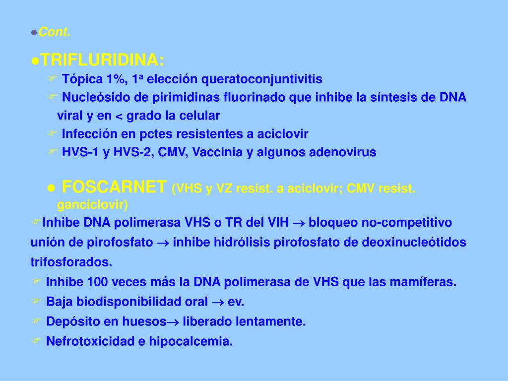 Cont. • TRIFLURIDINA: • Tópica 1%, 1a elección queratoconjuntivitis • Nucleósido de pirimidinas fluorinado que inhibe la síntesis de DNA viral y en < grado la celular • Infección en pctes resistentes a aciclovir • HVS-1 y HVS-2, CMV, Vaccinia y algunos adenovirus • FOSCARNET (VHS y VZ resist. a aciclovir; CMV resist. ganciclovir) • Inhibe DNA polimerasa VHS o TR del VIH bloqueo no-competitivo unión de pirofosfato inhibe hidrólisis pirofosfato de deoxinucleótidos trifosforados. • Inhibe 100 veces más la DNA polimerasa de VHS que las mamíferas. • Baja biodisponibilidad oral ev. • Depósito en huesos liberado lentamente. • Nefrotoxicidad e hipocalcemia.