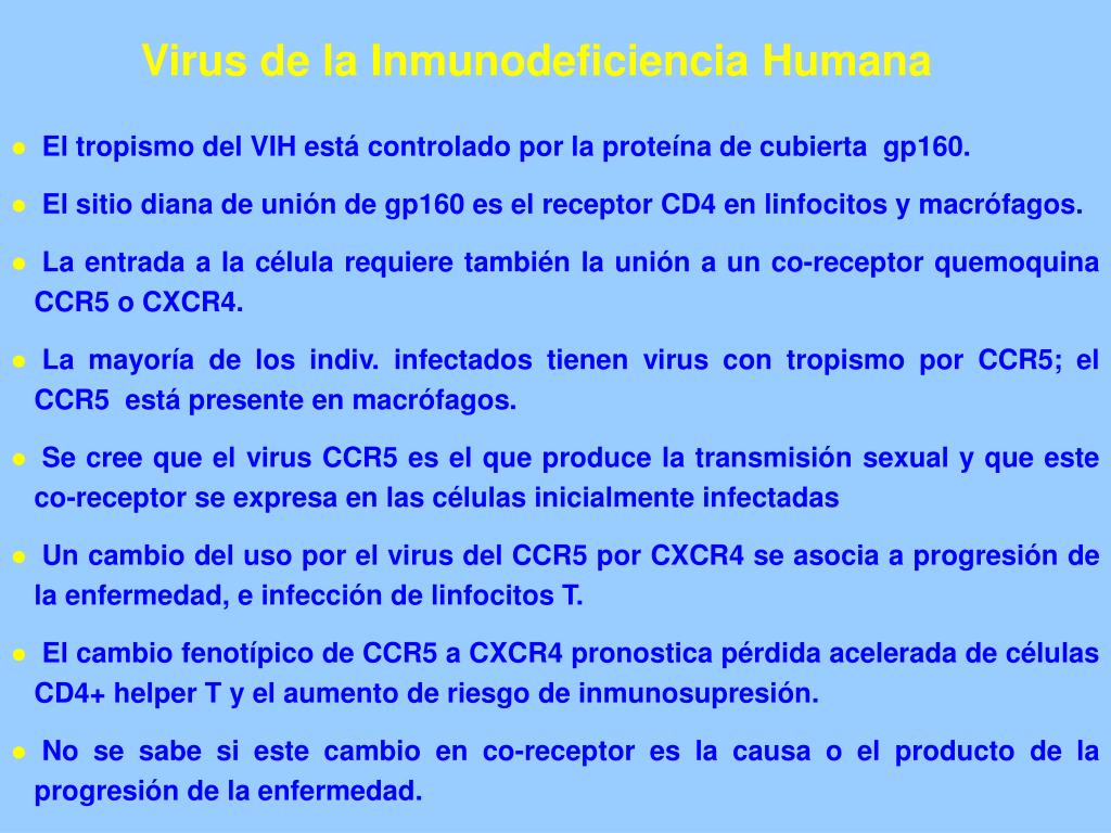 Virus de la Inmunodeficiencia Humana El tropismo del VIH está controlado por la proteína de cubierta gp160. El sitio diana de unión de gp160 es el receptor CD4 en linfocitos y macrófagos. La entrada a la célula requiere también la unión a un co-receptor quemoquina CCR5 o CXCR4. La mayoría de los indiv. infectados tienen virus con tropismo por CCR5; el CCR5 está presente en macrófagos. Se cree que el virus CCR5 es el que produce la transmisión sexual y que este co-receptor se expresa en las células inicialmente infectadas Un cambio del uso por el virus del CCR5 por CXCR4 se asocia a progresión de la enfermedad, e infección de linfocitos T. El cambio fenotípico de CCR5 a CXCR4 pronostica pérdida acelerada de células CD4+ helper T y el aumento de riesgo de inmunosupresión. No se sabe si este cambio en co-receptor es la causa o el producto de la progresión de la enfermedad.