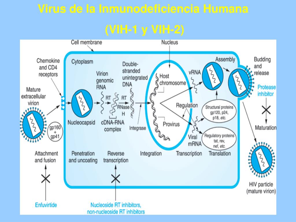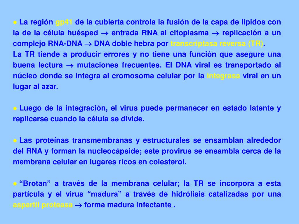 La región gp41 de la cubierta controla la fusión de la capa de lípidos con la de la célula huésped entrada RNA al citoplasma replicación a un complejo RNA-DNA DNA doble hebra por transcriptasa reversa (TR). La TR tiende a producir errores y no tiene una función que asegure una buena lectura mutaciones frecuentes. El DNA viral es transportado al núcleo donde se integra al cromosoma celular por la integrasa viral en un lugar al azar. • Luego de la integración, el virus puede permanecer en estado latente y replicarse cuando la célula se divide. • Las proteínas transmembranas y estructurales se ensamblan alrededor del RNA y forman la nucleocápside; este provirus se ensambla cerca de la membrana celular en lugares ricos en colesterol. • “Brotan” a través de la membrana celular; la TR se incorpora a esta partícula y el virus “madura” a través de hidrólisis catalizadas por una aspartil proteasa forma madura infectante .