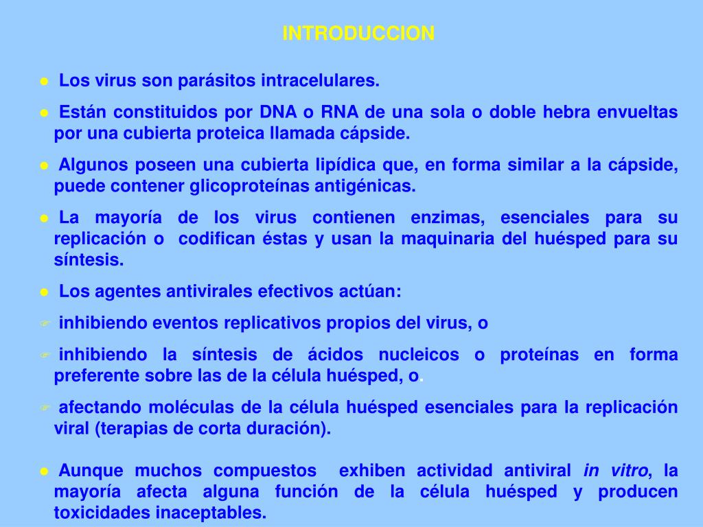 INTRODUCCION • Los virus son parásitos intracelulares. • Están constituidos por DNA o RNA de una sola o doble hebra envueltas por una cubierta proteica llamada cápside. • Algunos poseen una cubierta lipídica que, en forma similar a la cápside, puede contener glicoproteínas antigénicas. • La mayoría de los virus contienen enzimas, esenciales para su replicación o codifican éstas y usan la maquinaria del huésped para su síntesis. • Los agentes antivirales efectivos actúan: • inhibiendo eventos replicativos propios del virus, o • inhibiendo la síntesis de ácidos nucleicos o proteínas en forma preferente sobre las de la célula huésped, o. • afectando moléculas de la célula huésped esenciales para la replicación viral (terapias de corta duración). • Aunque muchos compuestos exhiben actividad antiviral in vitro, la mayoría afecta alguna función de la célula huésped y producen toxicidades inaceptables.