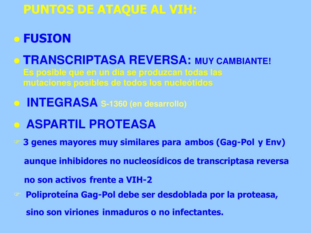 PUNTOS DE ATAQUE AL VIH: • FUSION • TRANSCRIPTASA REVERSA:MUY CAMBIANTE! Es posible que en un día se produzcan todas las mutaciones posibles de todos los nucleótidos • INTEGRASA S-1360 (en desarrollo) • ASPARTIL PROTEASA • 3 genes mayores muy similares paraambos (Gag-Poly Env) aunque inhibidores no nucleosídicos de transcriptasa reversa no son activosfrente a VIH-2 • Poliproteína Gag-Pol debe ser desdoblada por la proteasa, sino son virionesinmaduros o no infectantes.
