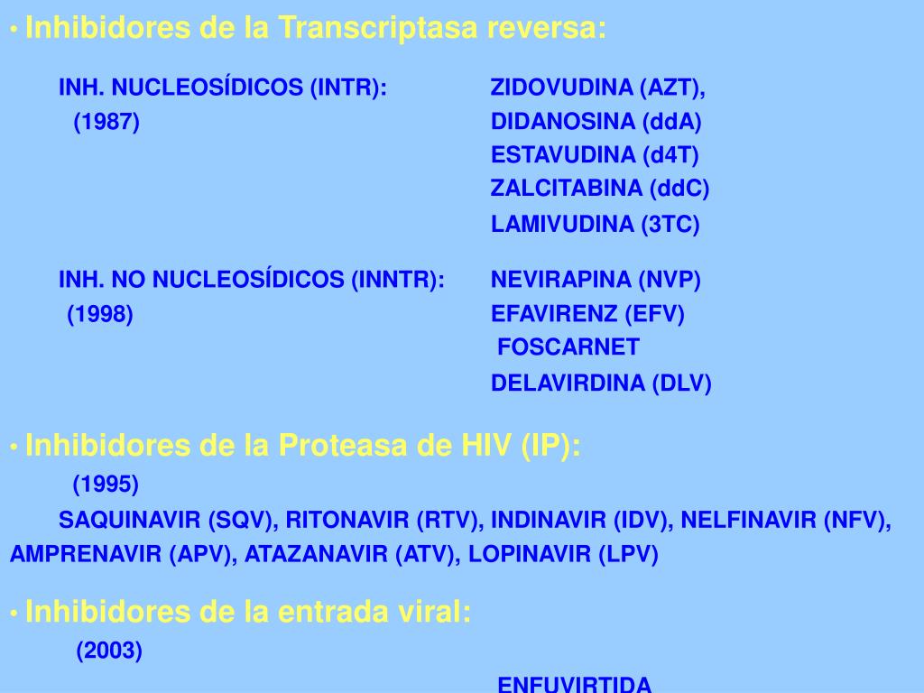 Inhibidores de la Transcriptasa reversa: INH.NUCLEOSÍDICOS (INTR): ZIDOVUDINA (AZT), (1987) DIDANOSINA (ddA) ESTAVUDINA (d4T) ZALCITABINA (ddC) LAMIVUDINA (3TC) INH.NO NUCLEOSÍDICOS (INNTR): NEVIRAPINA (NVP) (1998) EFAVIRENZ (EFV) FOSCARNET DELAVIRDINA (DLV) • Inhibidores de la Proteasa de HIV (IP): (1995) SAQUINAVIR (SQV), RITONAVIR (RTV), INDINAVIR (IDV), NELFINAVIR (NFV), AMPRENAVIR (APV), ATAZANAVIR (ATV), LOPINAVIR (LPV) • Inhibidores de la entrada viral: (2003) ENFUVIRTIDA