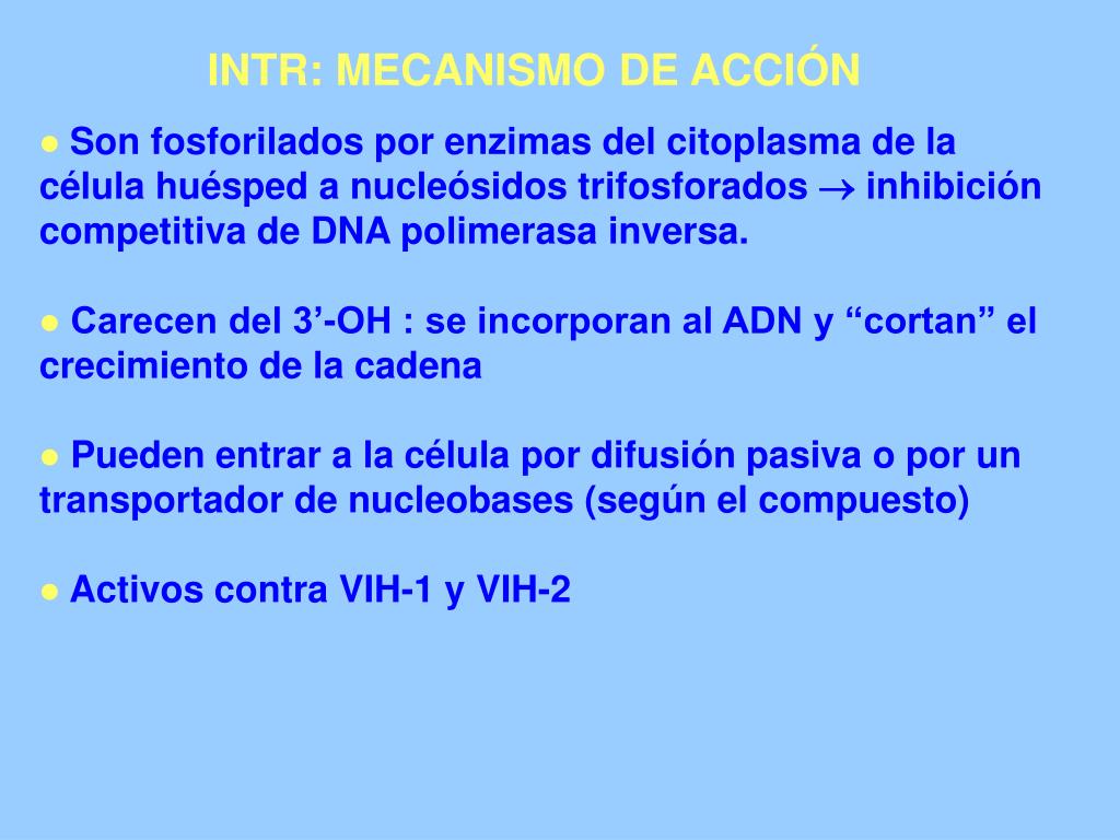 INTR: MECANISMO DE ACCIÓN • Son fosforilados por enzimas del citoplasma de la célula huésped a nucleósidos trifosforados inhibición competitiva de DNA polimerasa inversa. • Carecen del 3’-OH : se incorporan al ADN y “cortan” el crecimiento de la cadena • Pueden entrar a la célula por difusión pasiva o por un transportador de nucleobases (según el compuesto) • Activos contra VIH-1 y VIH-2