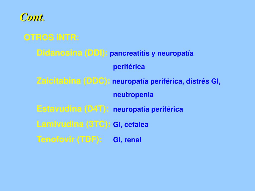 Cont. OTROS INTR: Didanosina (DDI): pancreatitis y neuropatía periférica Zalcitabina (DDC): neuropatía periférica, distrés GI, neutropenia Estavudina (D4T): neuropatía periférica Lamivudina (3TC): GI, cefalea Tenofovir (TDF): GI, renal