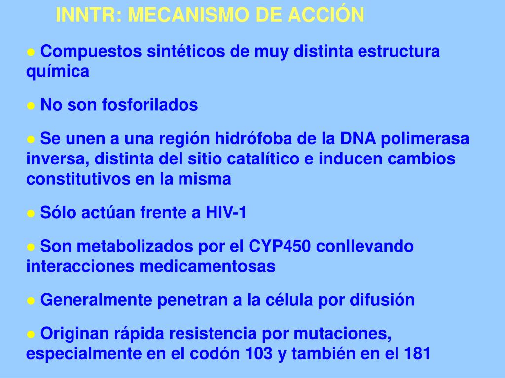 INNTR: MECANISMO DE ACCIÓN • Compuestos sintéticos de muy distinta estructura química • No son fosforilados • Se unen a una región hidrófoba de la DNA polimerasa inversa, distinta del sitio catalítico e inducen cambios constitutivos en la misma • Sólo actúan frente a HIV-1 • Son metabolizados por el CYP450 conllevando interacciones medicamentosas • Generalmente penetran a la célula por difusión • Originan rápida resistencia por mutaciones, especialmente en el codón 103 y también en el 181