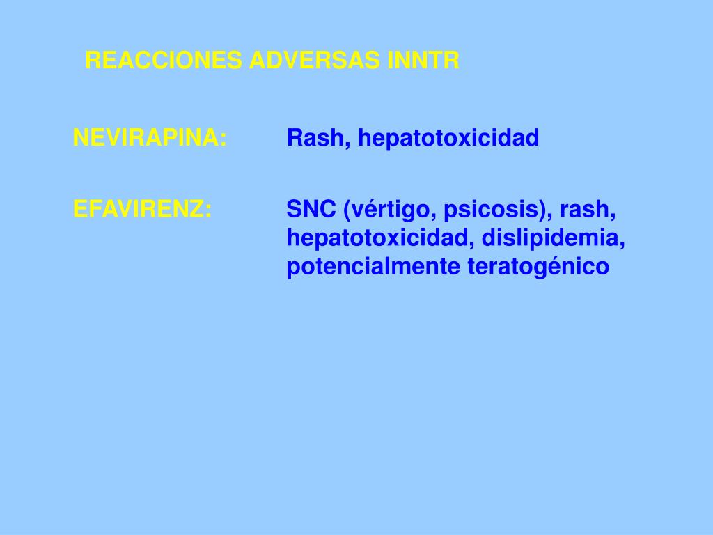 REACCIONES ADVERSAS INNTR NEVIRAPINA:Rash, hepatotoxicidad EFAVIRENZ: SNC (vértigo, psicosis), rash, hepatotoxicidad, dislipidemia, potencialmente teratogénico
