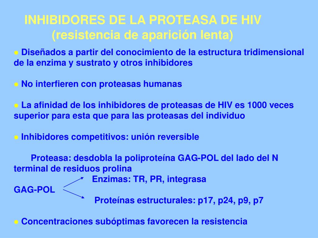 INHIBIDORES DE LA PROTEASA DE HIV (resistencia de aparición lenta) • Diseñados a partir del conocimiento de la estructura tridimensional de la enzima y sustrato y otros inhibidores • No interfieren con proteasas humanas • La afinidad de los inhibidores de proteasas de HIV es 1000 veces superior para esta que para las proteasas del individuo • Inhibidores competitivos: unión reversible Proteasa: desdobla la poliproteína GAG-POL del lado del N terminal de residuos prolina Enzimas: TR, PR, integrasa GAG-POL Proteínas estructurales: p17, p24, p9, p7 • Concentraciones subóptimas favorecen la resistencia