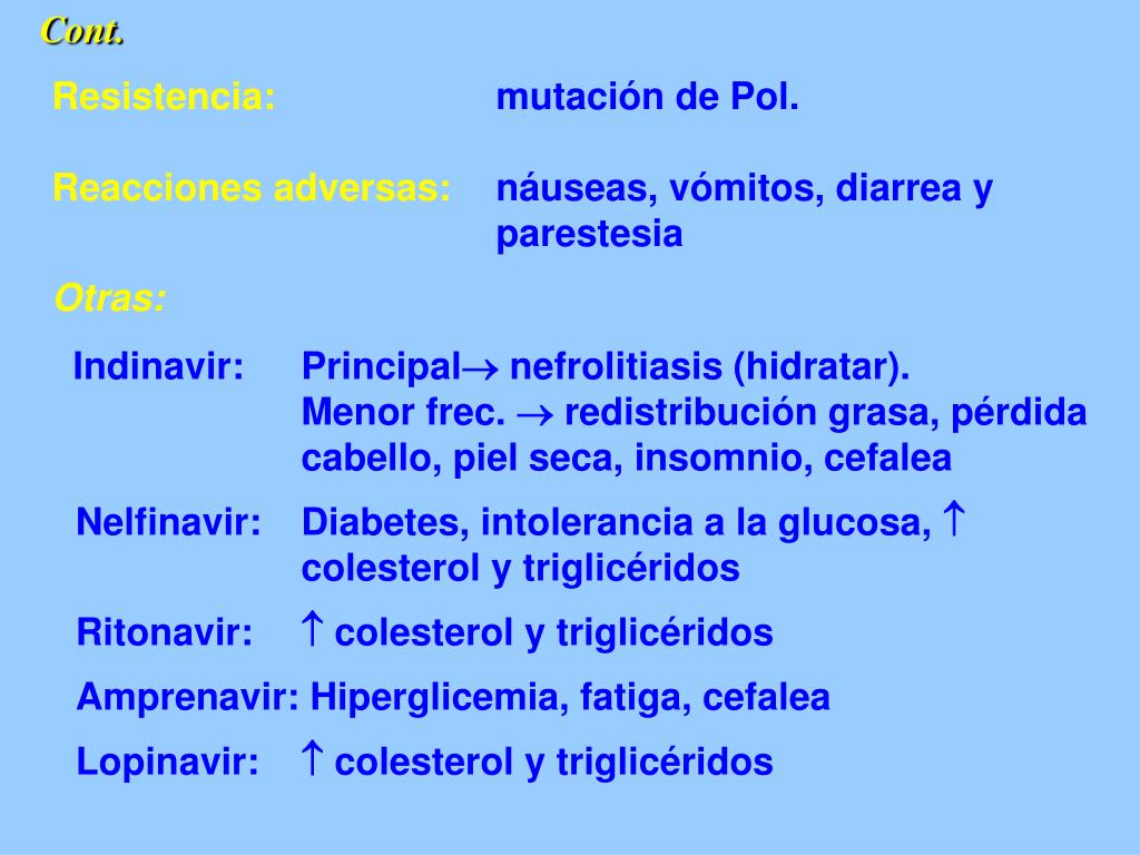 Cont. Resistencia: mutación de Pol. Reacciones adversas: náuseas, vómitos, diarrea y parestesia Otras: Indinavir: Principal nefrolitiasis (hidratar). Menor frec. redistribución grasa, pérdida cabello, piel seca, insomnio, cefalea Nelfinavir: Diabetes, intolerancia a la glucosa, colesterol y triglicéridos Ritonavir: colesterol y triglicéridos Amprenavir: Hiperglicemia, fatiga, cefalea Lopinavir: colesterol y triglicéridos
