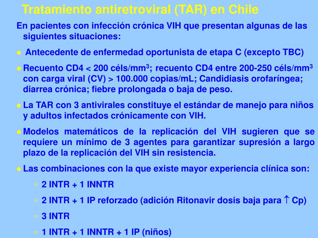Tratamiento antiretroviral (TAR) en Chile En pacientes con infección crónica VIH que presentan algunas de las siguientes situaciones: • Antecedente de enfermedad oportunista de etapa C (excepto TBC) • Recuento CD4 < 200 céls/mm3;recuento CD4 entre 200-250 céls/mm3 con carga viral (CV) > 100.000 copias/mL; Candidiasis orofaríngea; diarrea crónica; fiebre prolongada o baja de peso. • La TAR con 3 antivirales constituye el estándar de manejo para niños y adultos infectados crónicamente con VIH. • Modelos matemáticos de la replicación del VIH sugieren que se requiere un mínimo de 3 agentes para garantizar supresión a largo plazo de la replicación del VIH sin resistencia. • Las combinaciones con la que existe mayor experiencia clínica son: • 2 INTR + 1 INNTR • 2 INTR + 1 IP reforzado (adición Ritonavir dosis baja para Cp) • 3 INTR • 1 INTR + 1 INNTR + 1 IP (niños)
