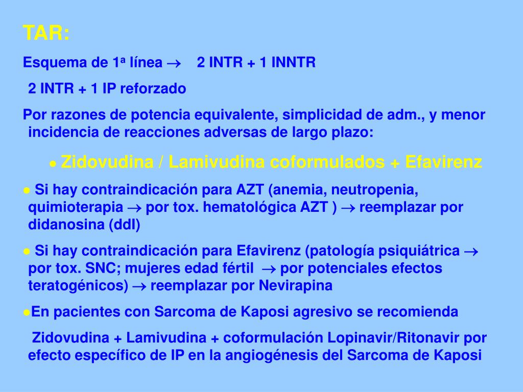TAR: Esquema de 1a línea 2 INTR + 1 INNTR 2 INTR + 1 IP reforzado Por razones de potencia equivalente, simplicidad de adm., y menor incidencia de reacciones adversas de largo plazo: • Zidovudina / Lamivudina coformulados + Efavirenz • Si hay contraindicación para AZT (anemia, neutropenia, quimioterapia por tox. hematológica AZT ) reemplazar por didanosina (ddI) • Si hay contraindicación para Efavirenz (patología psiquiátrica por tox. SNC; mujeres edad fértil por potenciales efectos teratogénicos) reemplazar por Nevirapina • En pacientes con Sarcoma de Kaposi agresivo se recomienda Zidovudina + Lamivudina + coformulación Lopinavir/Ritonavir por efecto específico de IP en la angiogénesis del Sarcoma de Kaposi