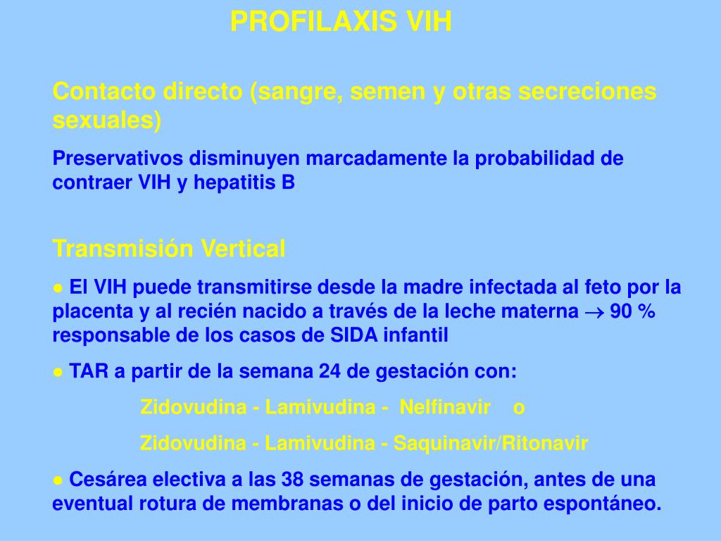 PROFILAXIS VIH Contacto directo (sangre, semen y otras secreciones sexuales) Preservativos disminuyen marcadamente la probabilidad de contraer VIH y hepatitis B Transmisión Vertical El VIH puede transmitirse desde la madre infectada al feto por la placenta y al recién nacido a través de la leche materna 90 % responsable de los casos de SIDA infantil TAR a partir de la semana 24 de gestación con: Zidovudina - Lamivudina - Nelfinavir o Zidovudina - Lamivudina - Saquinavir/Ritonavir Cesárea electiva a las 38 semanas de gestación, antes de una eventual rotura de membranas o del inicio de parto espontáneo.