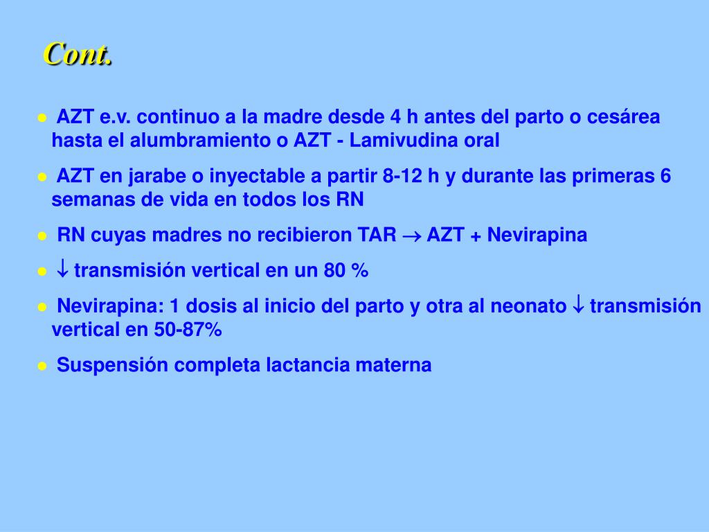 Cont. AZT e.v. continuo a la madre desde 4 h antes del parto o cesárea hasta el alumbramiento o AZT - Lamivudina oral AZT en jarabe o inyectable a partir 8-12 h y durante las primeras 6 semanas de vida en todos los RN RN cuyas madres no recibieron TAR AZT + Nevirapina transmisión vertical en un 80 % Nevirapina: 1 dosis al inicio del parto y otra al neonato transmisión vertical en 50-87% Suspensión completa lactancia materna