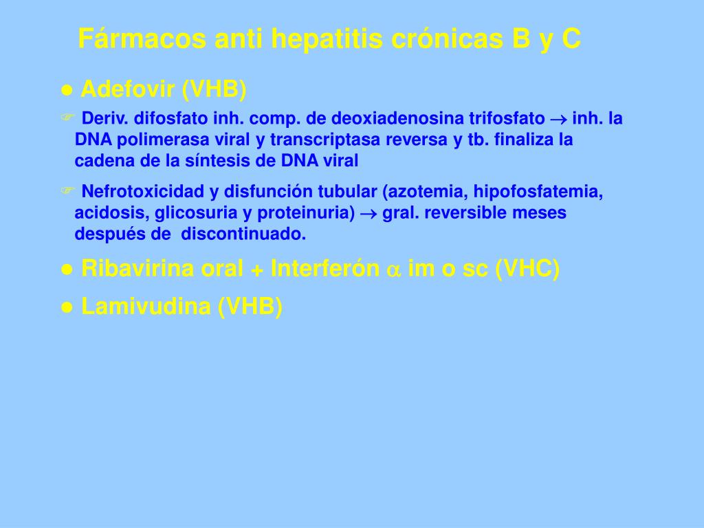 Fármacos anti hepatitis crónicas B y C • Adefovir (VHB) • Deriv. difosfato inh. comp. de deoxiadenosina trifosfato inh. la DNA polimerasa viral y transcriptasa reversa y tb. finaliza la cadena de la síntesis de DNA viral • Nefrotoxicidad y disfunción tubular (azotemia, hipofosfatemia, acidosis, glicosuria y proteinuria) gral. reversible meses después de discontinuado. • Ribavirina oral + Interferón im o sc (VHC) • Lamivudina (VHB)