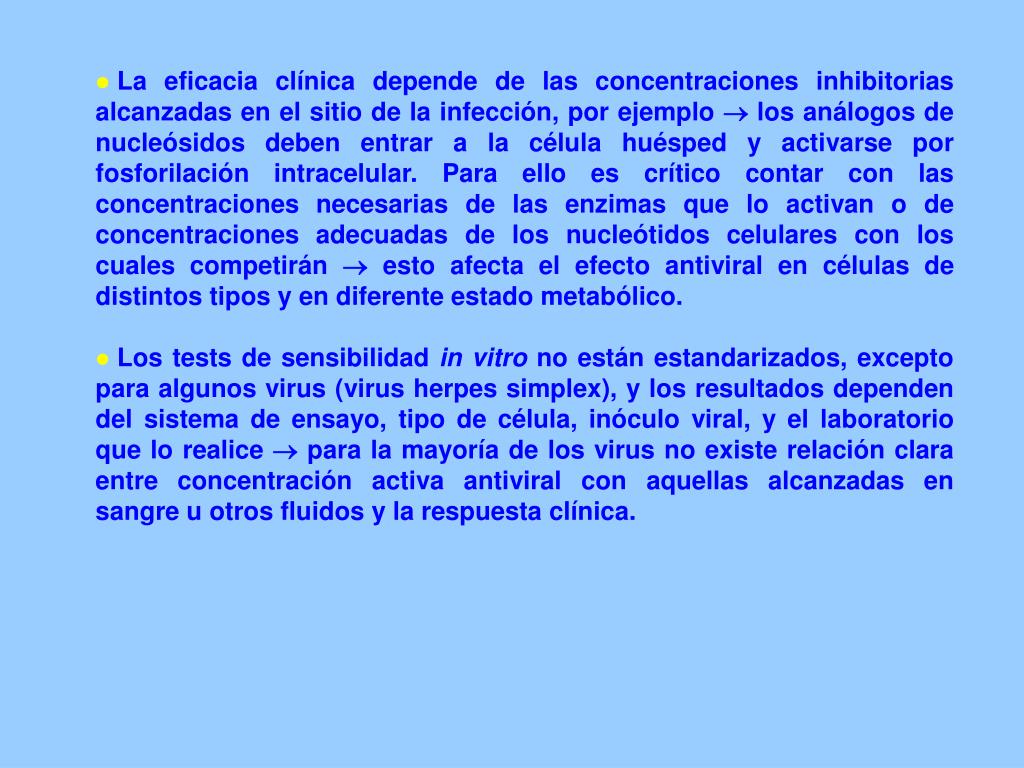La eficacia clínica depende de las concentraciones inhibitorias alcanzadas en el sitio de la infección, por ejemplo los análogos de nucleósidos deben entrar a la célula huésped y activarse por fosforilación intracelular. Para ello es crítico contar con las concentraciones necesarias de las enzimas que lo activan o de concentraciones adecuadas de los nucleótidos celulares con los cuales competirán esto afecta el efecto antiviral en células de distintos tipos y en diferente estado metabólico. • Los tests de sensibilidad in vitro no están estandarizados, excepto para algunos virus (virus herpes simplex), y los resultados dependen del sistema de ensayo, tipo de célula, inóculo viral, y el laboratorio que lo realice para la mayoría de los virus no existe relación clara entre concentración activa antiviral con aquellas alcanzadas en sangre u otros fluidos y la respuesta clínica.