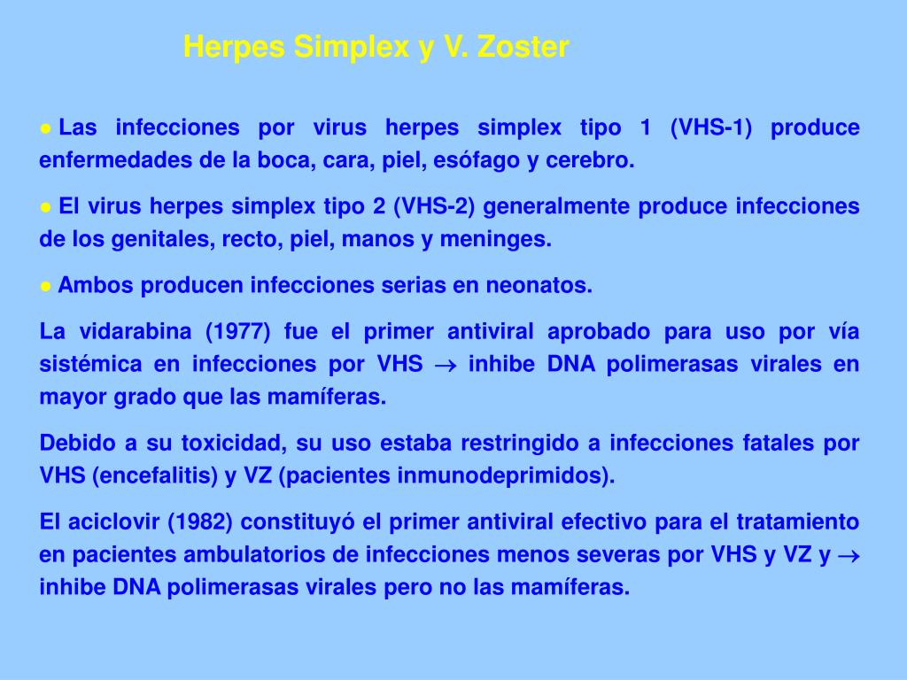 Herpes Simplex y V. Zoster Las infecciones por virus herpes simplex tipo 1 (VHS-1) produce enfermedades de la boca, cara, piel, esófago y cerebro. El virus herpes simplex tipo 2 (VHS-2) generalmente produce infecciones de los genitales, recto, piel, manos y meninges. Ambos producen infecciones serias en neonatos. La vidarabina (1977) fue el primer antiviral aprobado para uso por vía sistémica en infecciones por VHS inhibe DNA polimerasas virales en mayor grado que las mamíferas. Debido a su toxicidad, su uso estaba restringido a infecciones fatales por VHS (encefalitis) y VZ (pacientes inmunodeprimidos). El aciclovir (1982) constituyó el primer antiviral efectivo para el tratamiento en pacientes ambulatorios de infecciones menos severas por VHS y VZ y inhibe DNA polimerasas virales pero no las mamíferas.