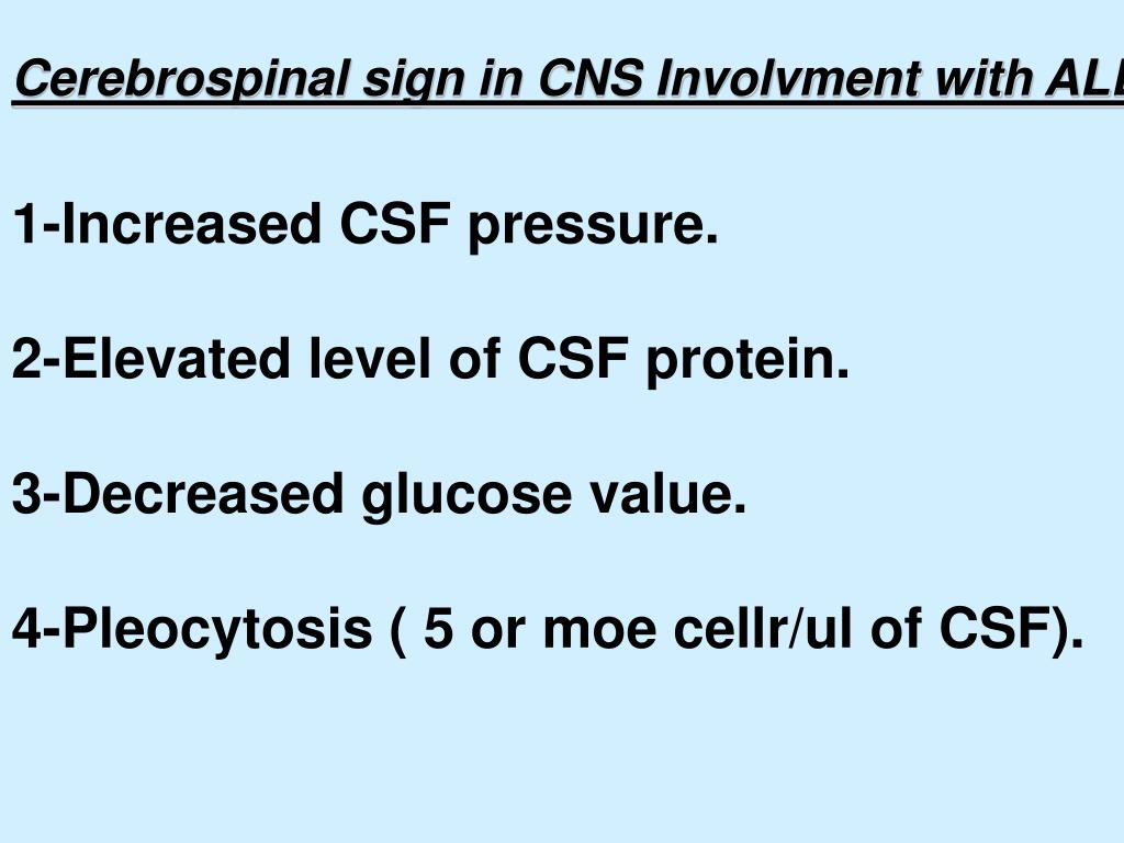 Cerebrospinal sign in CNS Involvment with ALL 1-Increased CSF pressure. 2-Elevated level of CSF protein. 3-Decreased glucose value. 4-Pleocytosis ( 5 or moe cellr/ul of CSF).