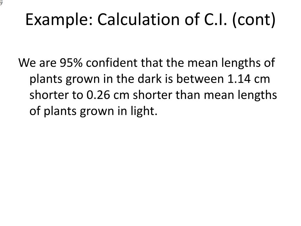 Example: Calculation of C.I. (cont) We are 95% confident that the mean lengths of plants grown in the dark is between 1.14 cm shorter to 0.26 cm shorter than mean lengths of plants grown in light.