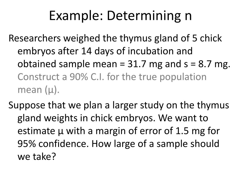 Example: Determining n Researchers weighed the thymus gland of 5 chick embryos after 14 days of incubation and obtained sample mean = 31.7 mg and s = 8.7 mg. Construct a 90% C.I. for the true population mean (μ). Suppose that we plan a larger study on the thymus gland weights in chick embryos. We want to estimate μ with a margin of error of 1.5 mg for 95% confidence. How large of a sample should we take?