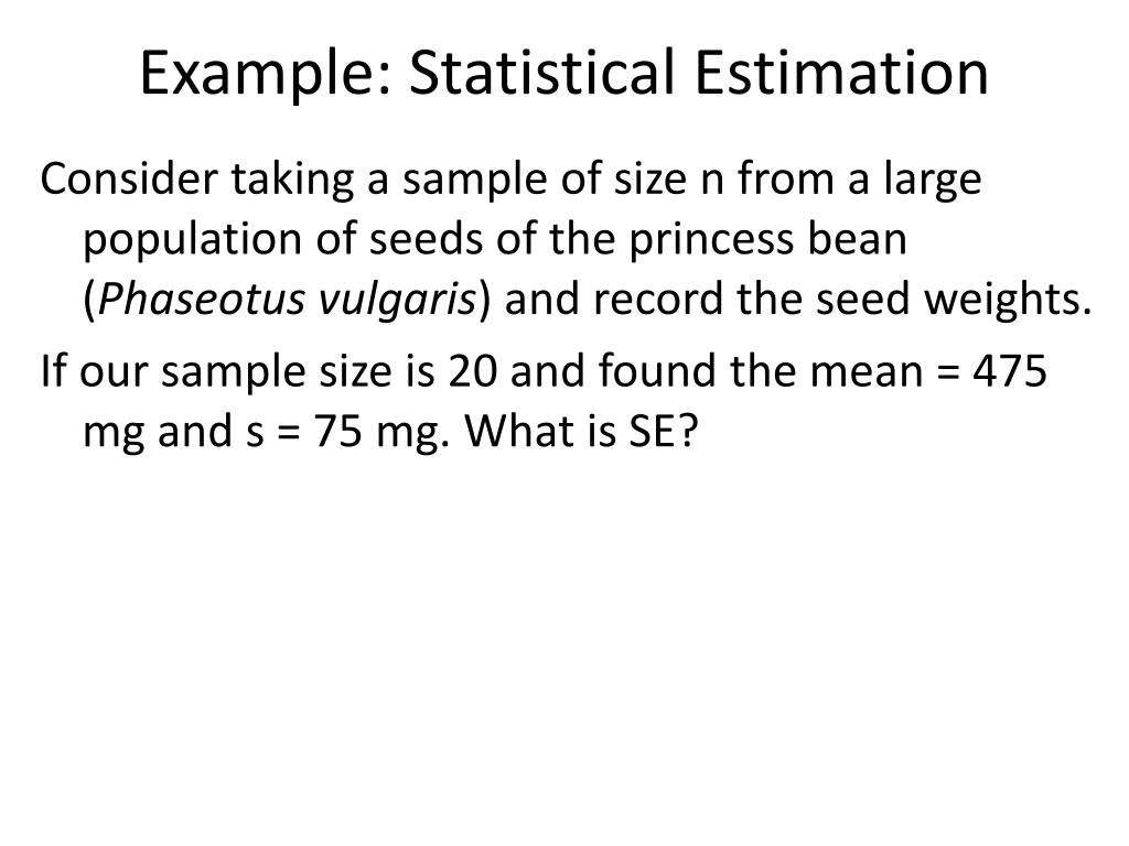 Example: Statistical Estimation Consider taking a sample of size n from a large population of seeds of the princess bean (Phaseotusvulgaris) and record the seed weights. If our sample size is 20 and found the mean = 475 mg and s = 75 mg. What is SE?