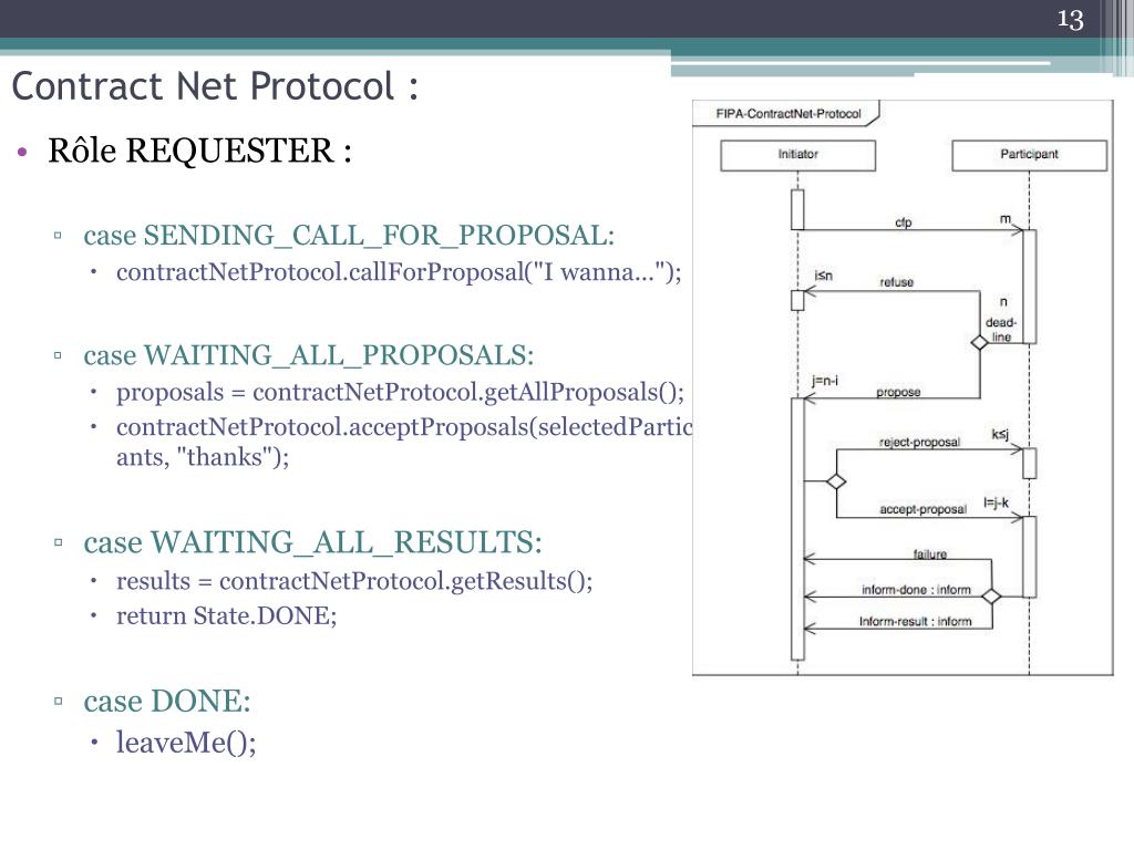 Contract Net Protocol : • Rôle REQUESTER : • case SENDING_CALL_FOR_PROPOSAL: • contractNetProtocol.callForProposal("I wanna..."); • case WAITING_ALL_PROPOSALS: • proposals = contractNetProtocol.getAllProposals(); • contractNetProtocol.acceptProposals(selectedParticipants, "thanks"); • case WAITING_ALL_RESULTS: • results = contractNetProtocol.getResults(); • return State.DONE; • case DONE: • leaveMe();