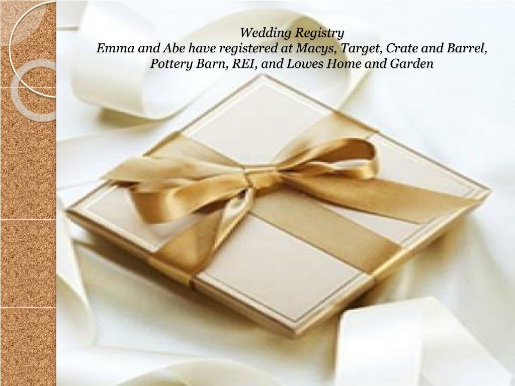 Wedding RegistryEmma and Abe have registered at Macys, Target, Crate and Barrel, Pottery Barn, REI, and Lowes Home and Garden