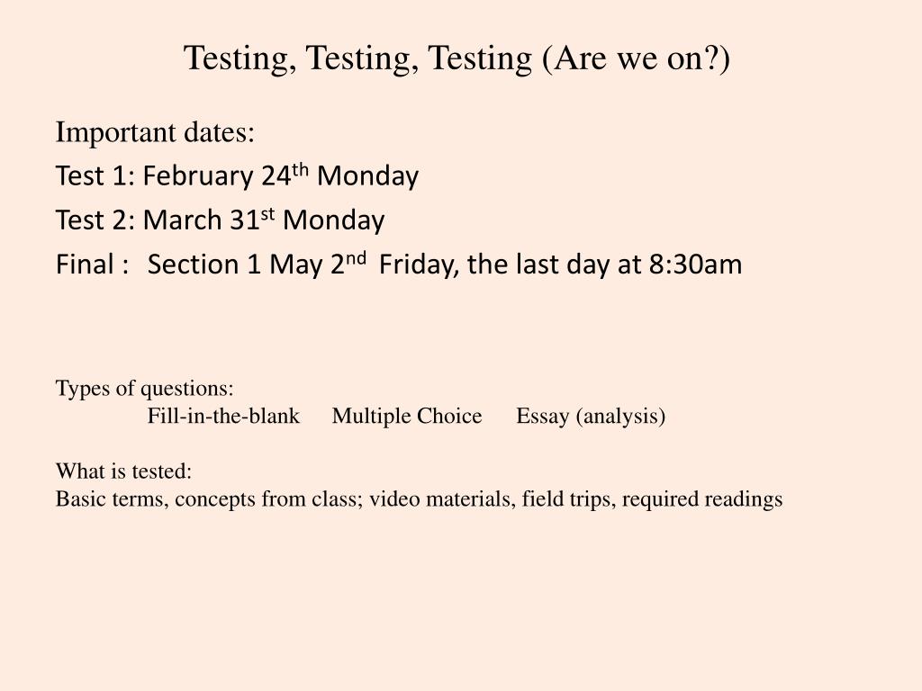 Testing, Testing, Testing (Are we on?) Important dates: Test 1: February 24thMonday Test 2: March 31stMonday Final : Section 1 May 2nd Friday, the last day at 8:30am Types of questions: Fill-in-the-blank Multiple Choice Essay (analysis) What is tested: Basic terms, concepts from class; video materials, field trips, required readings