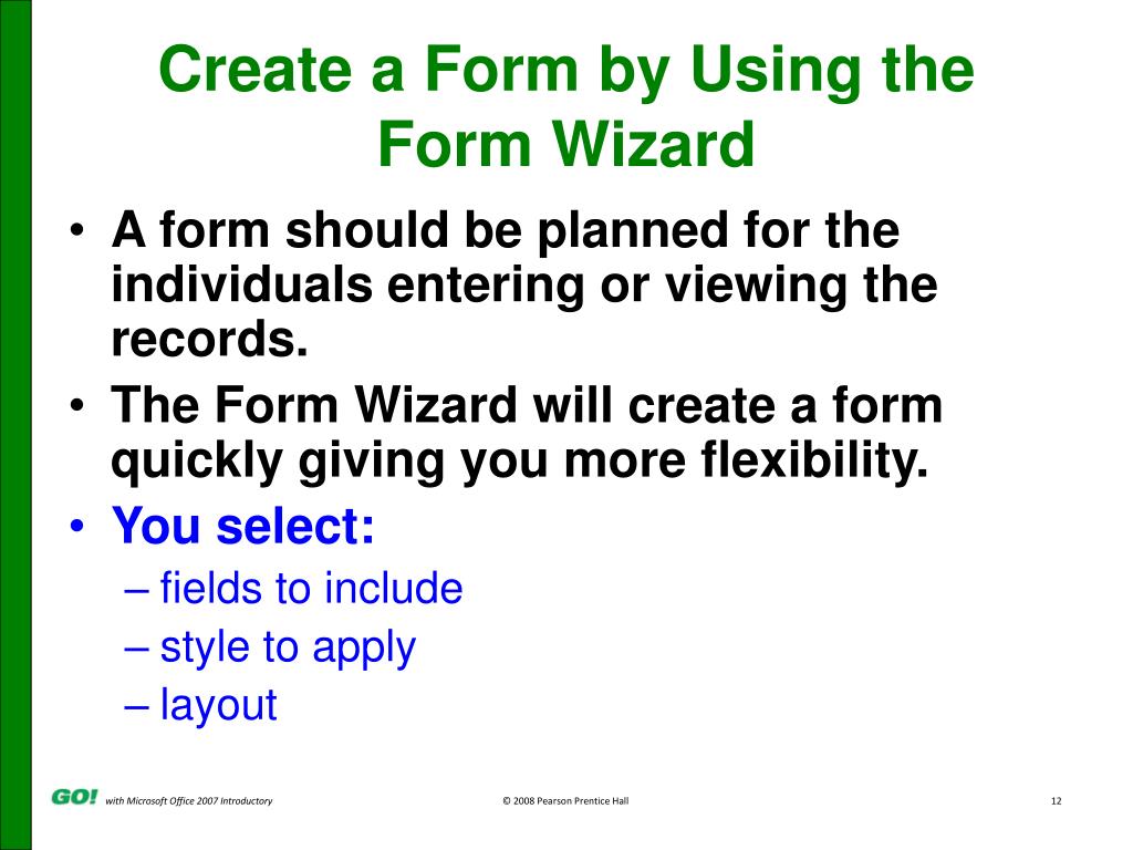 PowerPoint Presentation to Accompany GO! with Microsoft ® Office 2007 Introductory Chapter 14 Forms, Filters, and Reports. Objectives. Create a Form Use a Form to Add and Delete Records Create a Form by Using the Form Wizard Modify a Form in Design View and Layout View Filter Records.