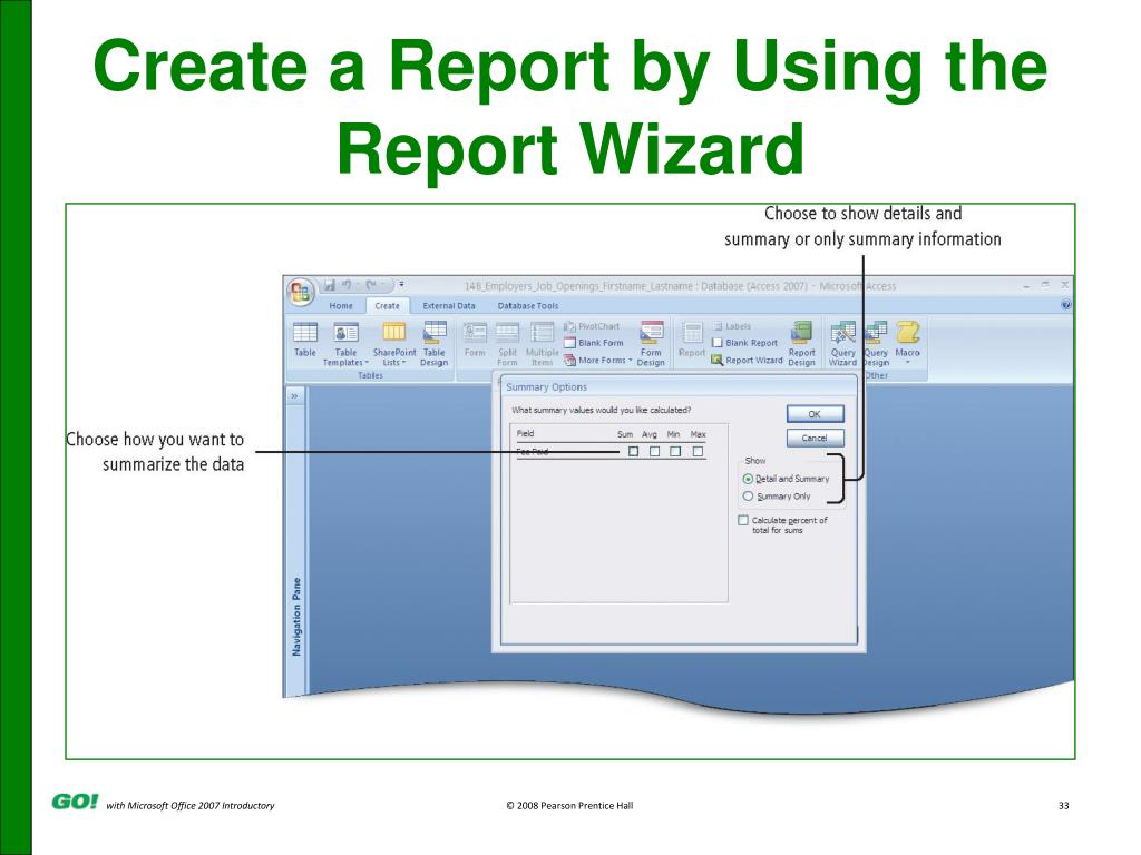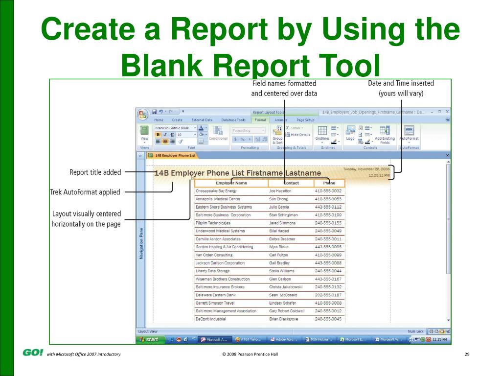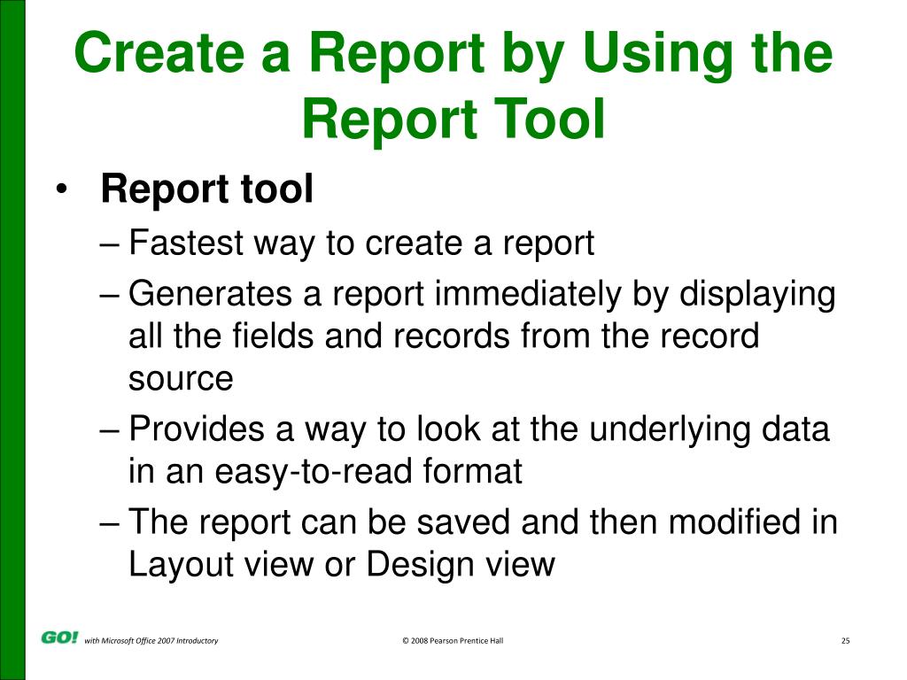 Covered Objectives • Create a Report by Using the Report Tool • Create a Report by Using the Blank Report Tool • Create a Report by Using the Report Wizard • Modify the Design of a Report • Print a Report and Keep Data Together