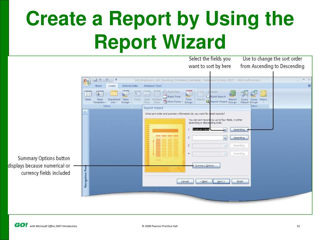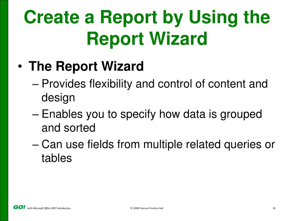Create a Report by Using the Report Wizard • The Report Wizard • Provides flexibility and control of content and design • Enables you to specify how data is grouped and sorted • Can use fields from multiple related queries or tables
