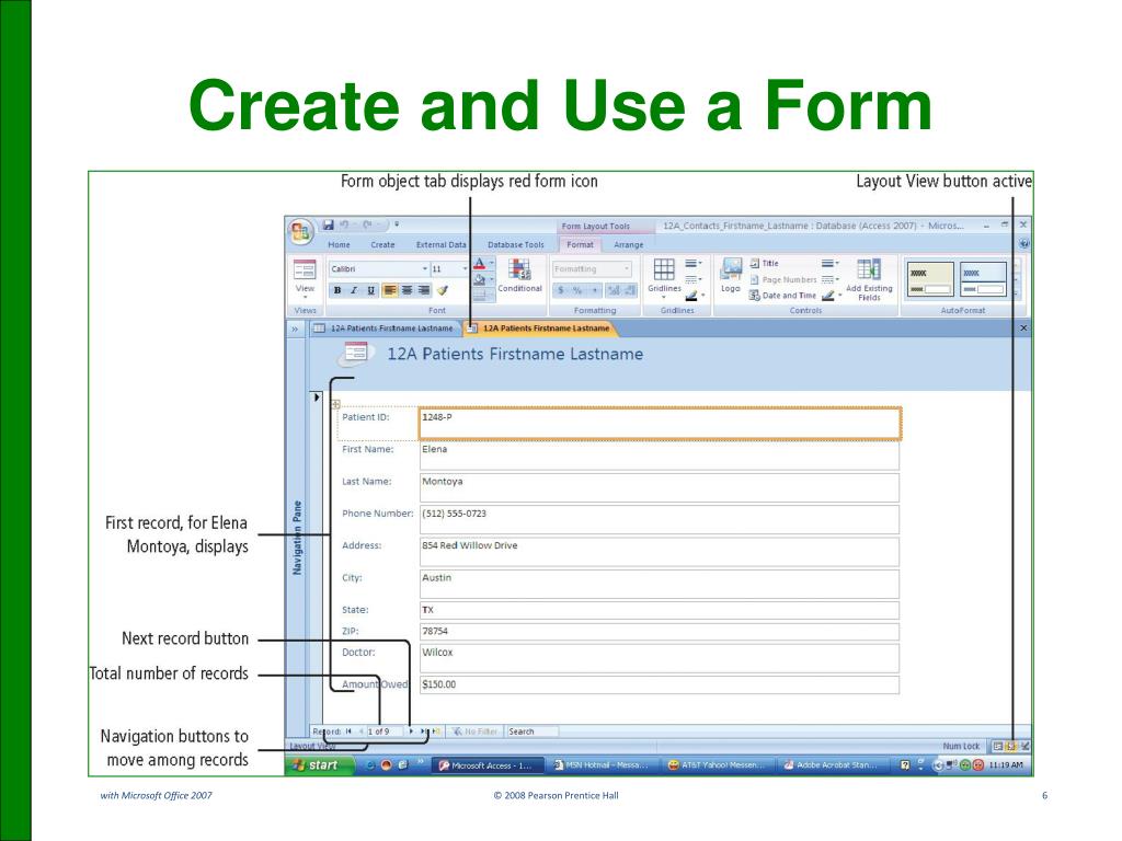 Create and Use a Form • Open table (data source). • On Ribbon, click Create tab. • In Forms group, click Form button to create a simple top-to-bottom format for form. • To enter data, view must be changed to Form view.