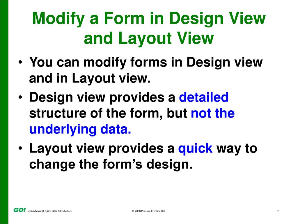 Modify a Form in Design View and Layout View • You can modify forms in Design view and in Layout view. • Design view provides a detailed structure of the form, but not the underlying data. • Layout view provides a quick way to change the form’s design.
