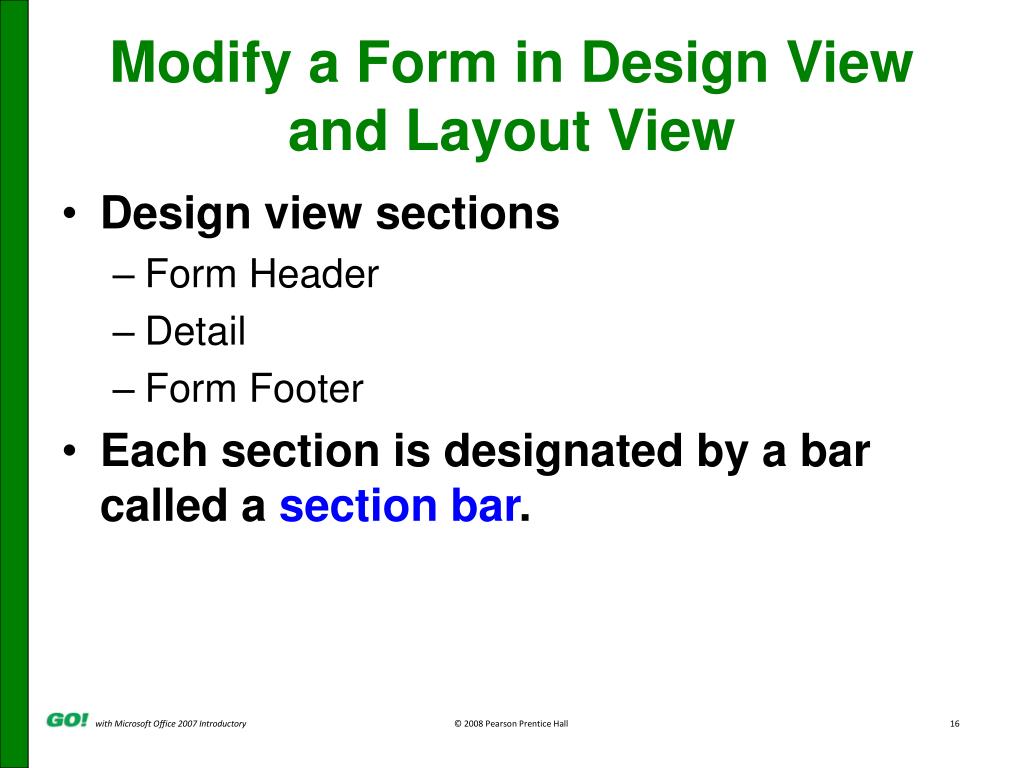 Modify a Form in Design View and Layout View • Design view sections • Form Header • Detail • Form Footer • Each section is designated by a bar called a section bar.