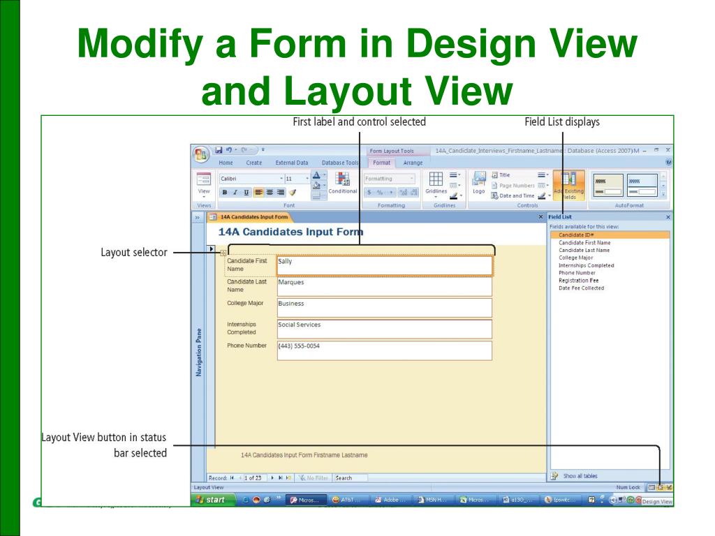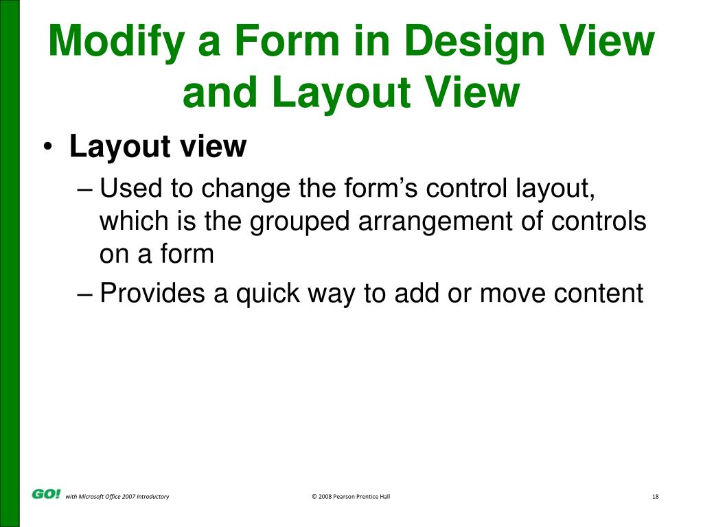 Modify a Form in Design View and Layout View Layout view Used to change the form’s control layout, which is the grouped arrangement of controls on a form Provides a quick way to add or move content