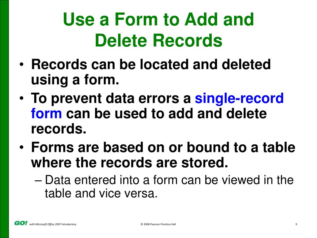 Use a Form to Add and Delete Records • Records can be located and deleted using a form. • To prevent data errors a single-record form can be used to add and delete records. • Forms are based on or bound to a table where the records are stored. • Data entered into a form can be viewed in the table and vice versa.