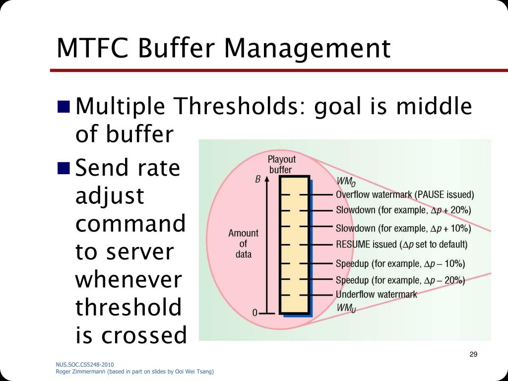 MTFC Buffer Management • Multiple Thresholds: goal is middle of buffer • Send rateadjustcommandto serverwheneverthresholdis crossed