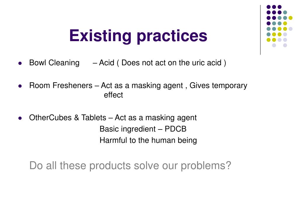 Existing practices • Bowl Cleaning – Acid ( Does not act on the uric acid ) • Room Fresheners – Act as a masking agent , Gives temporary effect • OtherCubes & Tablets – Act as a masking agent Basic ingredient – PDCB Harmful to the human being Do all these products solve our problems?