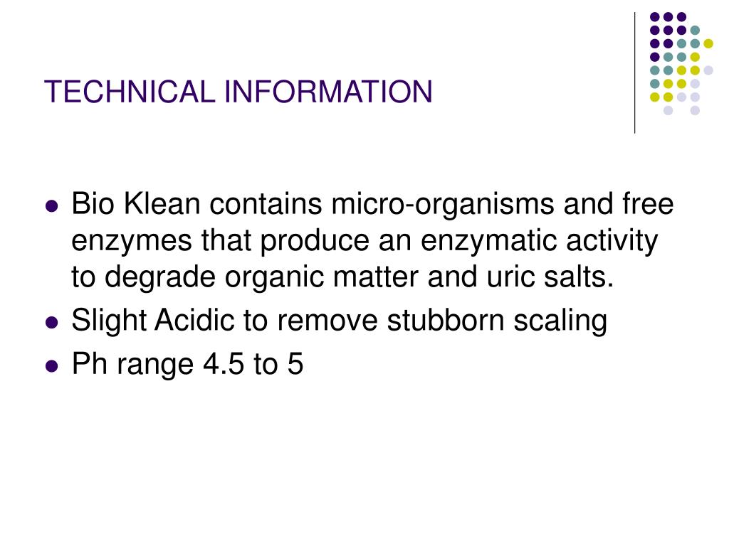 TECHNICAL INFORMATION • Bio Klean contains micro-organisms and free enzymes that produce an enzymatic activity to degrade organic matter and uric salts. • Slight Acidic to remove stubborn scaling • Ph range 4.5 to 5