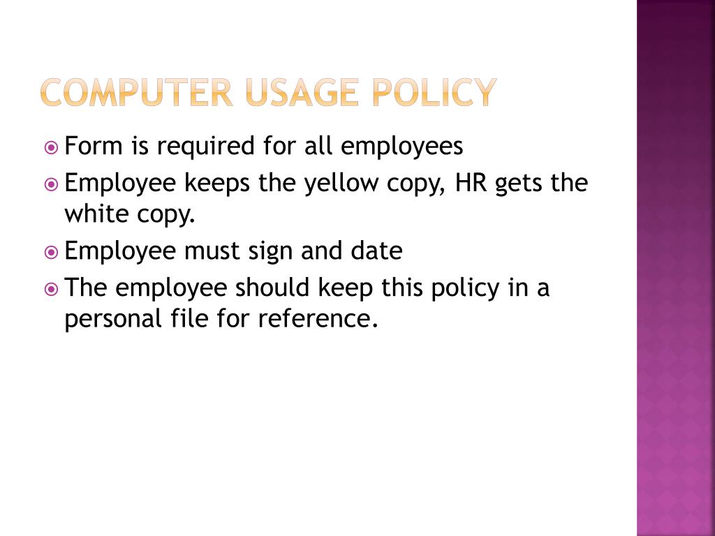 Computer usage policy • Form is required for all employees • Employee keeps the yellow copy, HR gets the white copy. • Employee must sign and date • The employee should keep this policy in a personal file for reference.
