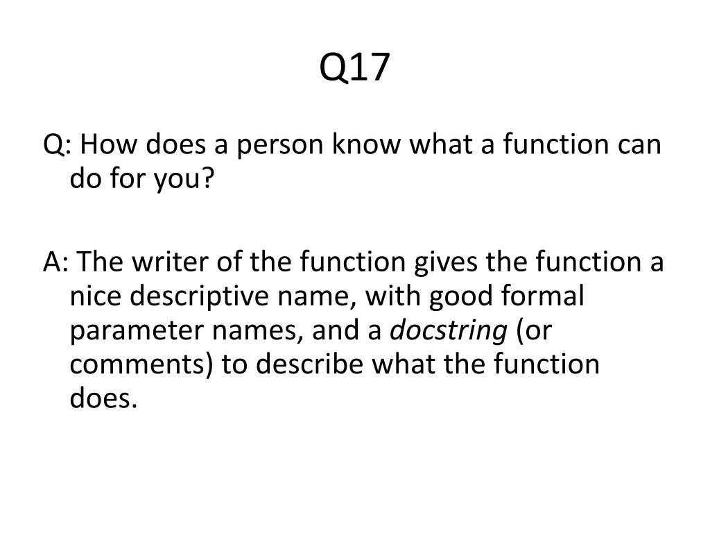 Q17 Q: How does a person know what a function can do for you? A: The writer of the function gives the function a nice descriptive name, with good formal parameter names, and a docstring (or comments) to describe what the function does.