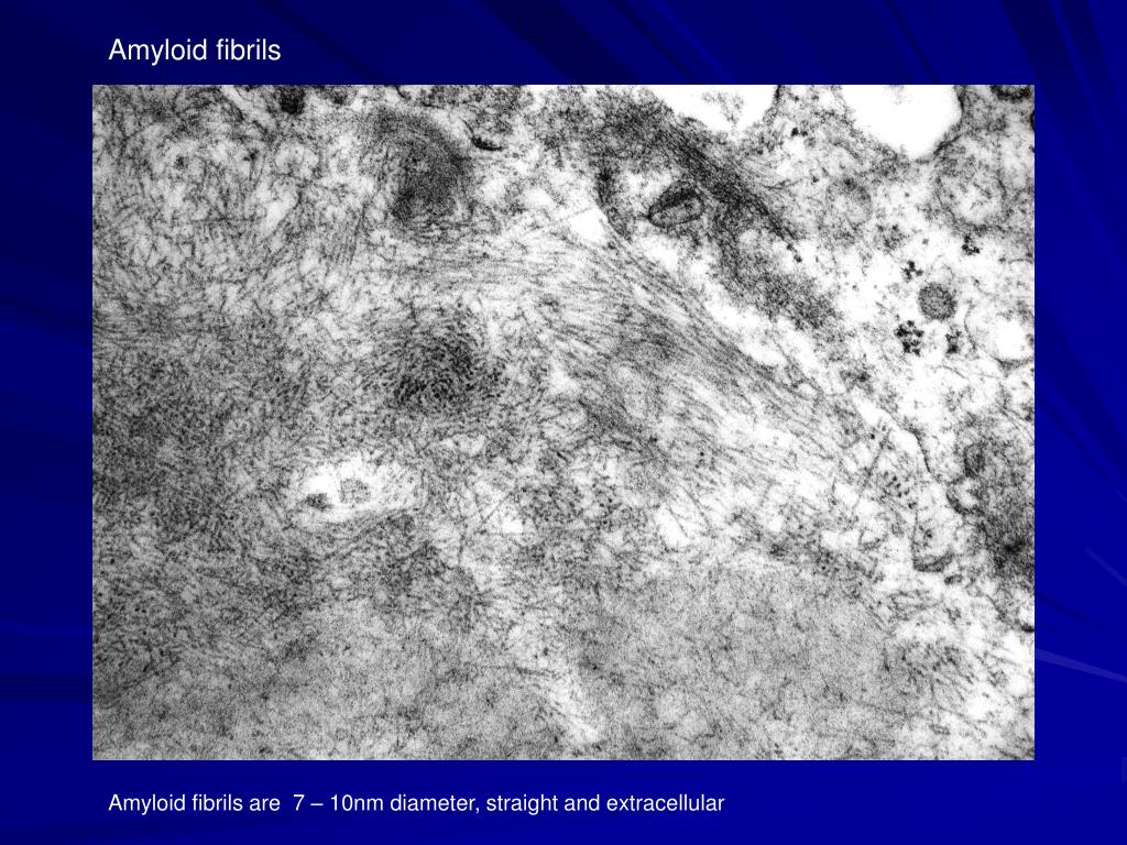 Amyloid fibrils Amyloid fibrils are 7 – 10nm diameter, straight and extracellular