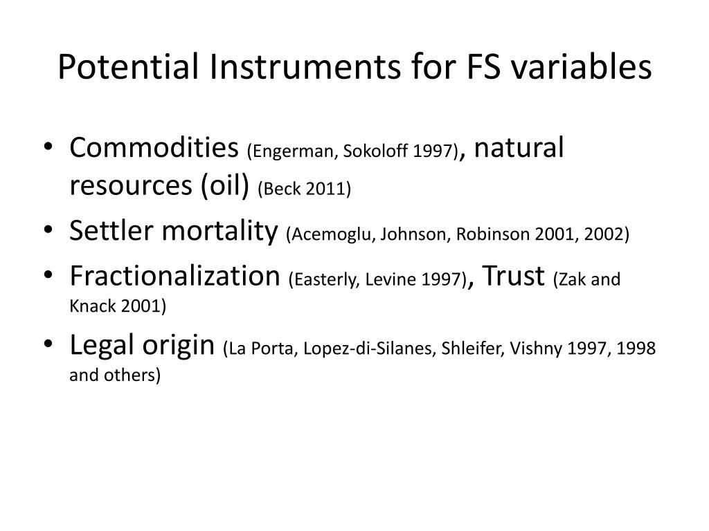 Potential Instruments for FS variables • Commodities (Engerman, Sokoloff 1997), natural resources (oil) (Beck 2011) • Settler mortality (Acemoglu, Johnson, Robinson 2001, 2002) • Fractionalization (Easterly, Levine 1997), Trust (Zak and Knack 2001) • Legal origin (La Porta, Lopez-di-Silanes, Shleifer, Vishny 1997, 1998 and others)