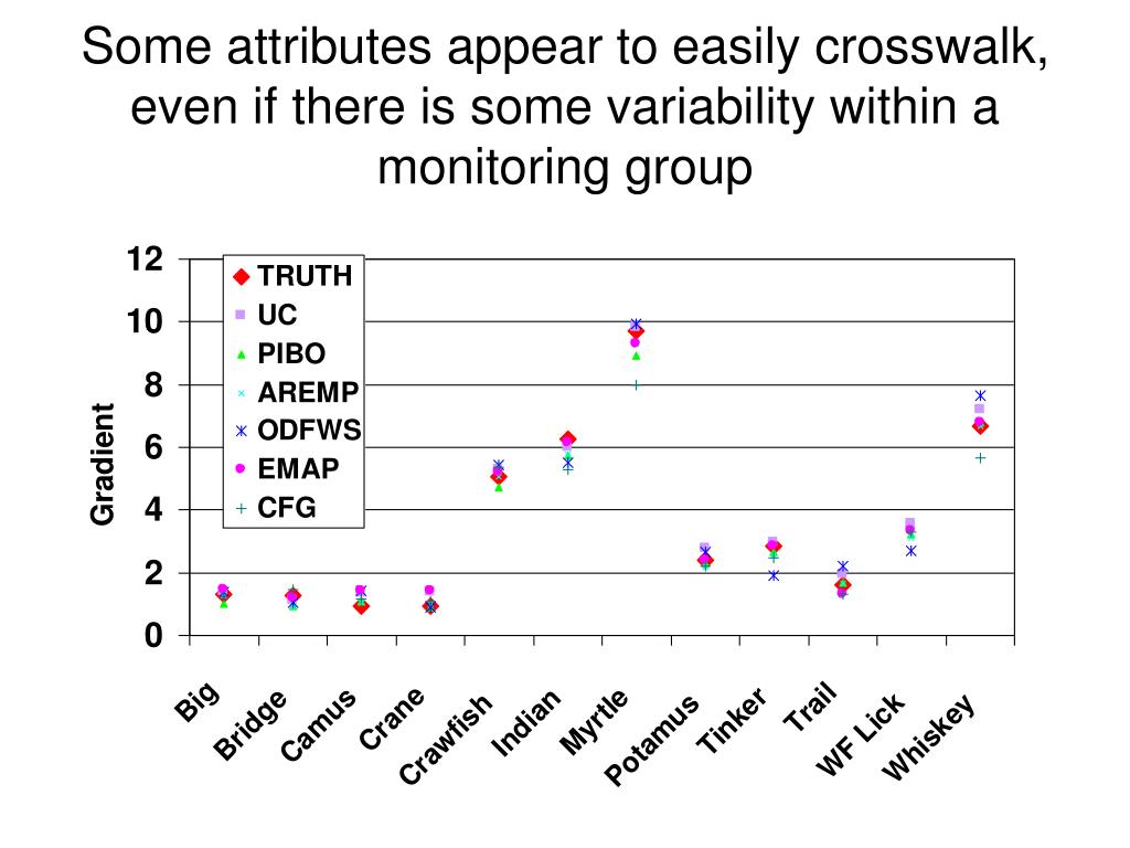 Some attributes appear to easily crosswalk, even if there is some variability within a monitoring group