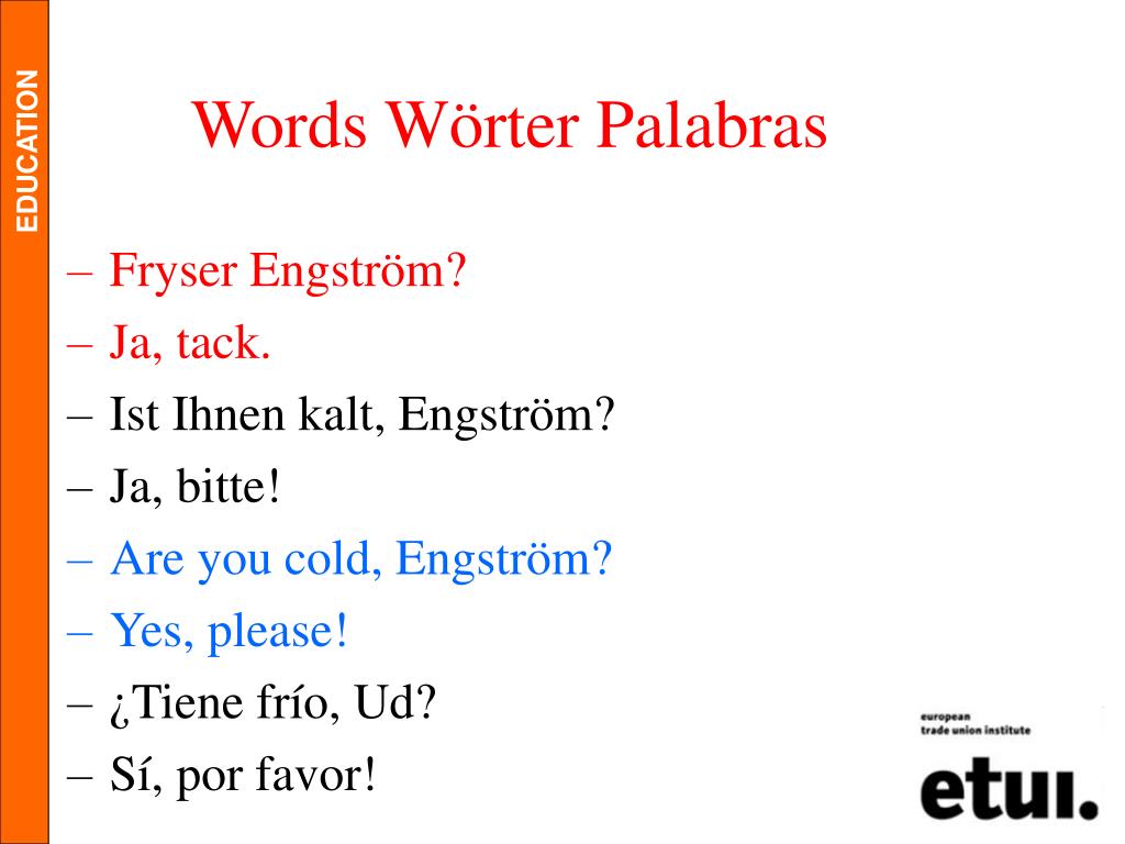 Words Wörter Palabras • Fryser Engström? • Ja, tack. • Ist Ihnen kalt, Engström? • Ja, bitte! • Are you cold, Engström? • Yes, please! • ¿Tiene frío, Ud? • Sí, por favor!