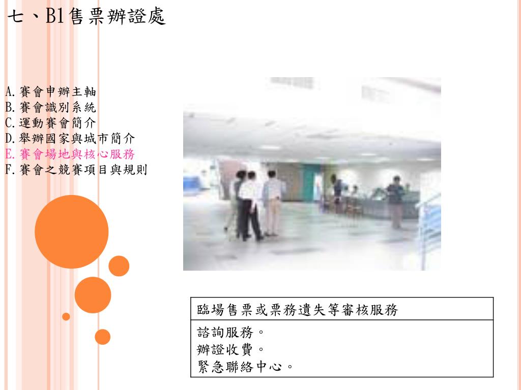 七、B1售票辦證處 A.賽會申辦主軸 B.賽會識別系統 C.運動賽會簡介 D.舉辦國家與城市簡介 E.賽會場地與核心服務 F.賽會之競賽項目與規則