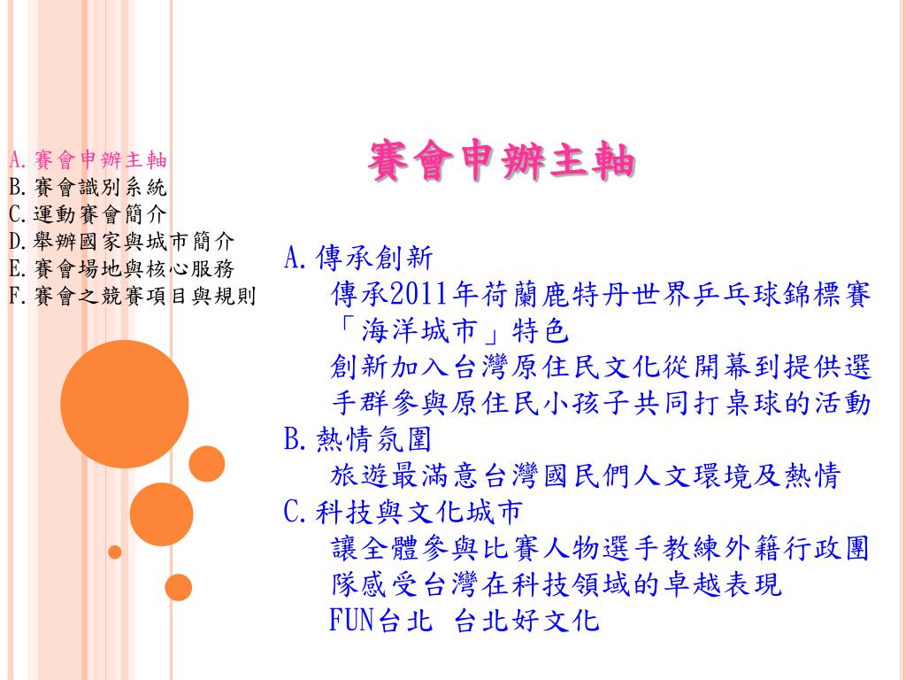 休閒運動管理 2013 WORLD TABLE TENNIS CHAMPIONSHIPS 2013世界桌球錦標賽【台灣桌球的未來】 A.賽會申辦主軸 B.賽會識別系統 C.運動賽會簡介 D.舉辦國家與城市簡介 E.賽會場地與核心服務 F.賽會之競賽項目與規則