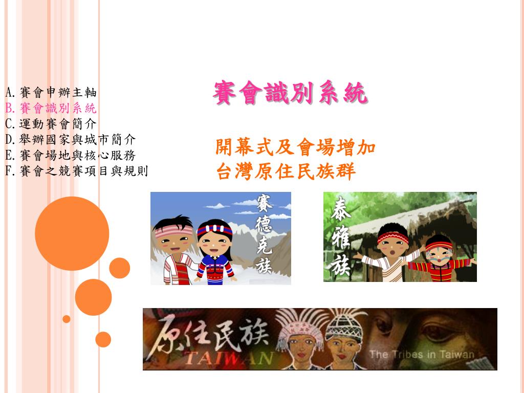 賽會識別系統 A.賽會申辦主軸 B.賽會識別系統 C.運動賽會簡介 D.舉辦國家與城市簡介 E.賽會場地與核心服務 F.賽會之競賽項目與規則 開幕式及會場增加 台灣原住民族群