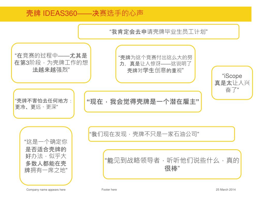 壳牌 ideas360——决赛选手的心声 “我肯定会去申请壳牌毕业生员工计划” “在竞赛的过程中——尤其是在第3阶段,为壳牌工作的想法越来越强烈” “壳牌为这个竞赛付出这么大的努力,真是让人惊讶——这说明了壳牌对学生创意的重视” “iScope 真是太让人兴奋了” “壳牌不害怕去任何地方:更冷、更远、更深” “现在,我会觉得壳牌是一个潜在雇主” “这是一个确定你是否适合壳牌的好办法,似乎大多数人都能在壳牌拥有一席之地” “我们现在发现,壳牌不只是一家石油公司” “能见到战略领导者,听听他们说些什么,真的很棒” Footer here