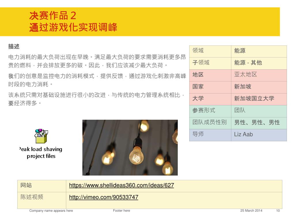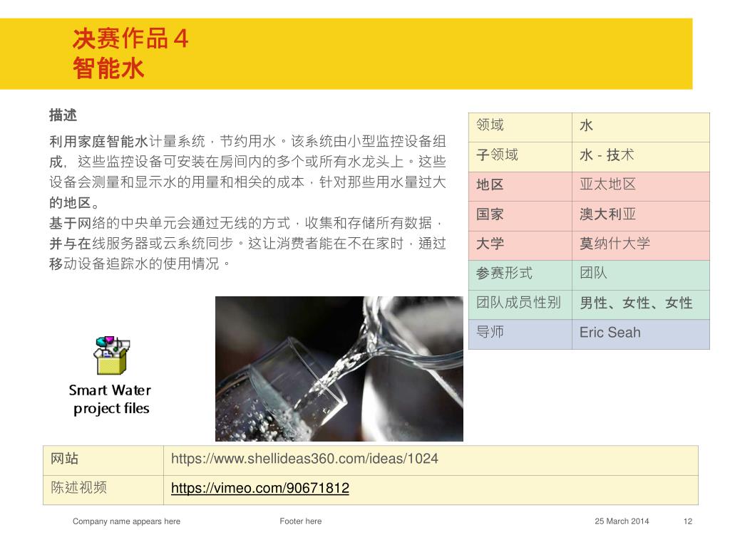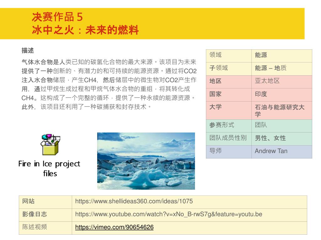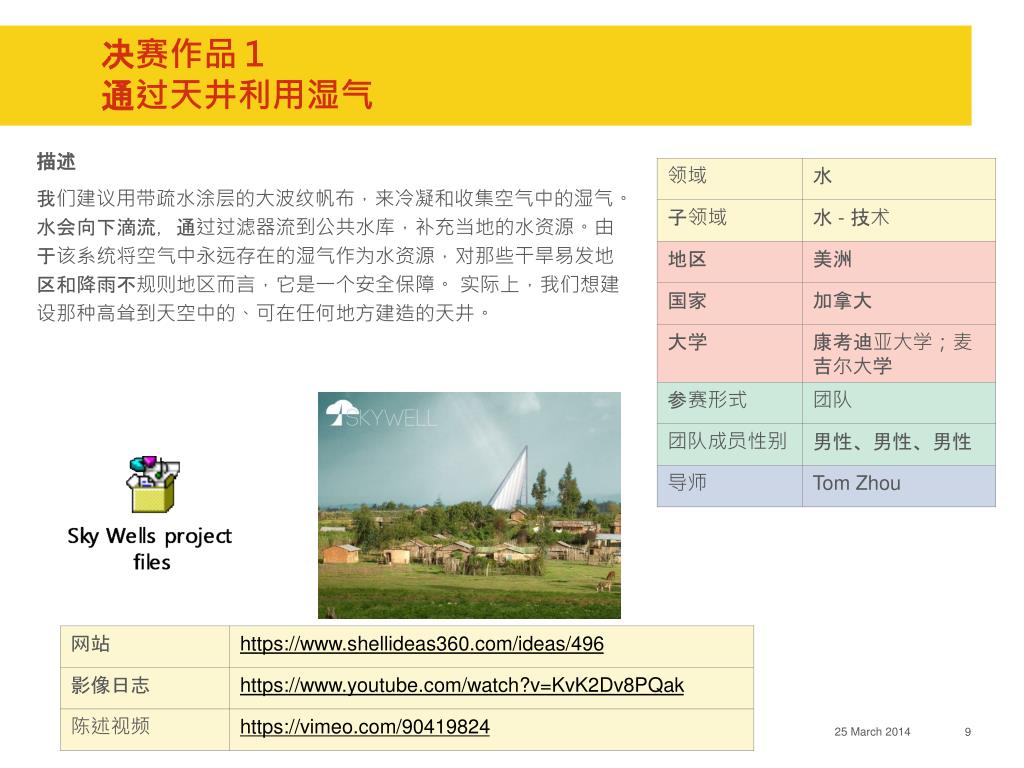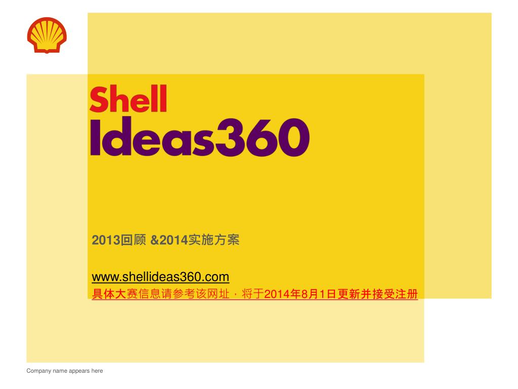 2013 回顾 & 2014 实施方案 www.shellideas360.com 具体大赛信息请参考该网址,将于 2014 年 8 月 1 日更新并接受注册. 目录. 项目背景介绍 大赛 意义 2014 参赛流程 介绍 2014 参赛选手阶段性学习安排 奖项 设置 2013 赛事 回顾. 项目背景 . 如果有一天冰能产生能源 如果有一天家庭能使用智能水系统 如果有一天湿气也可以帮助人类社会